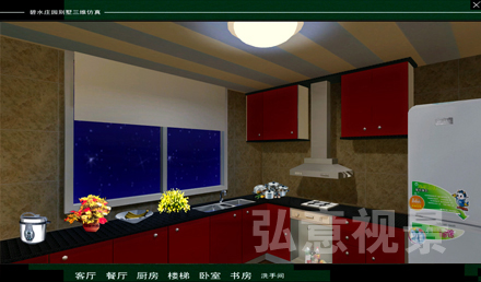 弘意制作人員在模型上使用單片建模方式,模型用的是簡模,由于空間小,裝飾品多,而且要突出表現(xiàn)材質(zhì)與燈光效果,所以在模 型制作方法、色彩把握、燈光表現(xiàn)上要比室外難得多。只有把技術(shù)和感覺容在一起才能做出上層的作品。同時這個作品還加入了打開 電視機、開關(guān)水龍頭、打開煤氣等虛擬現(xiàn)實交互功能。
